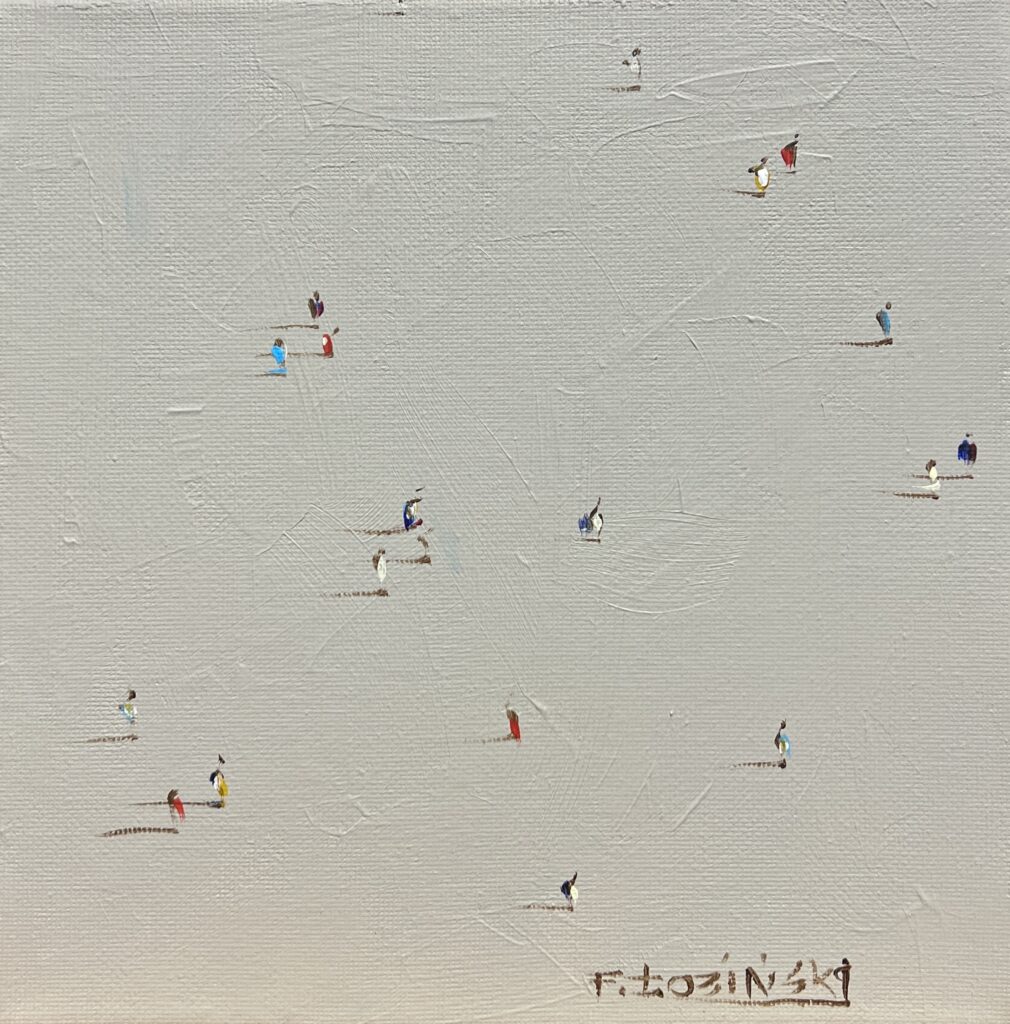 In this enchanting tableau, we witness a delicate dance of colors and figures suspended in a minimalist reverie. The canvas, seemingly vast and unending, is punctuated by tiny, vibrant silhouettes that evoke both movement and stillness. Each figure, a mere dash of pigment, hints at humanity amidst an expanse of textured white, suggesting a nod to the abstraction of aerial perspectives.