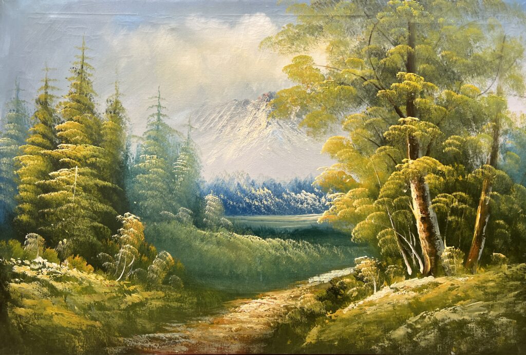 A sun dappled forest path winds through towering pines toward a tranquil mountain lake, its distant peaks softened by morning mist. Through gentle brushwork and a luminous palette of greens and golds, the painting evokes the quiet invitation of untouched wilderness a moment of serene discovery just beyond the trees.