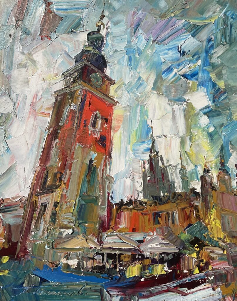 Clock Tower stands tall, drawing the viewer’s eye upward, while the surrounding buildings and sky are masterfully blended with expressive strokes. This work encapsulates both the history and vitality of Krakow, providing a sense of place and atmosphere unique to the city. It’s a must-have for collectors interested in urban landscapes, Polish heritage, or modern art.