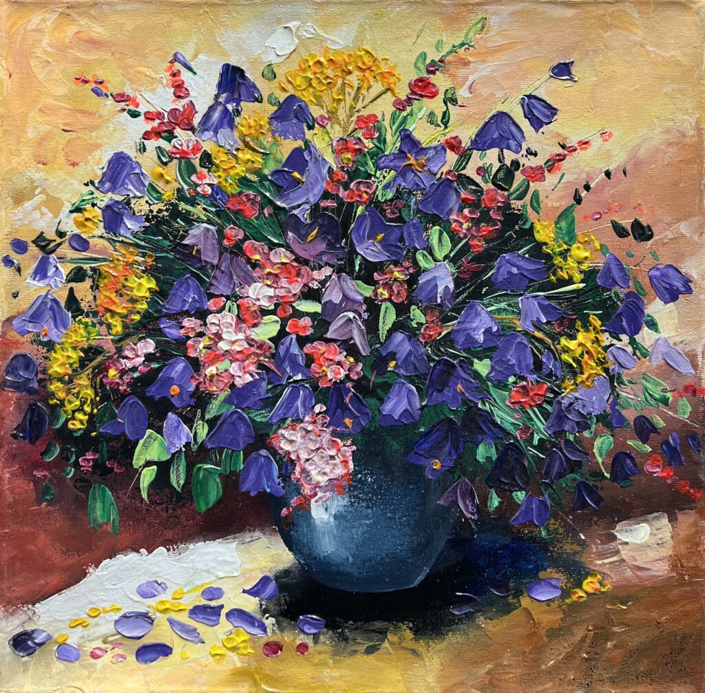Wild Garden Symphony is a jubilant explosion of color and texture, composed entirely with a palette knife. The artist orchestrates a vibrant bouquet of wildflowers, with dominant hues of violet, yellow, and red radiating from a deep blue vase. Each petal and leaf has been sculpted with confident, tactile strokes of the knife, giving the composition a lively, almost three-dimensional quality.