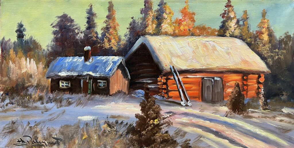 This enchanting painting captures the serene beauty of a secluded cabin nestled in a snow-covered landscape. The warm, golden hues of the wooden logs contrast beautifully with the crisp blues and whites of the winter scene, evoking a sense of comfort and rustic charm, while the soft glow of the late afternoon light bathes the trees in a mesmerizing dance of color.