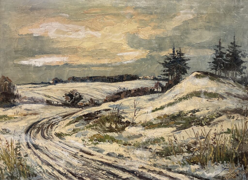 Step into a mesmerizing winter wonderland with this captivating painting that effortlessly transports you to a serene snow-covered landscape. The winding path meanders through an untouched field, where patches of grass and resilient shrubs peek through the pristine snow. In the distance, clusters of majestic trees stand tall, framed by a hazy horizon under a sky that's both brooding and hopeful, with sunlight daring to break through the clouds.