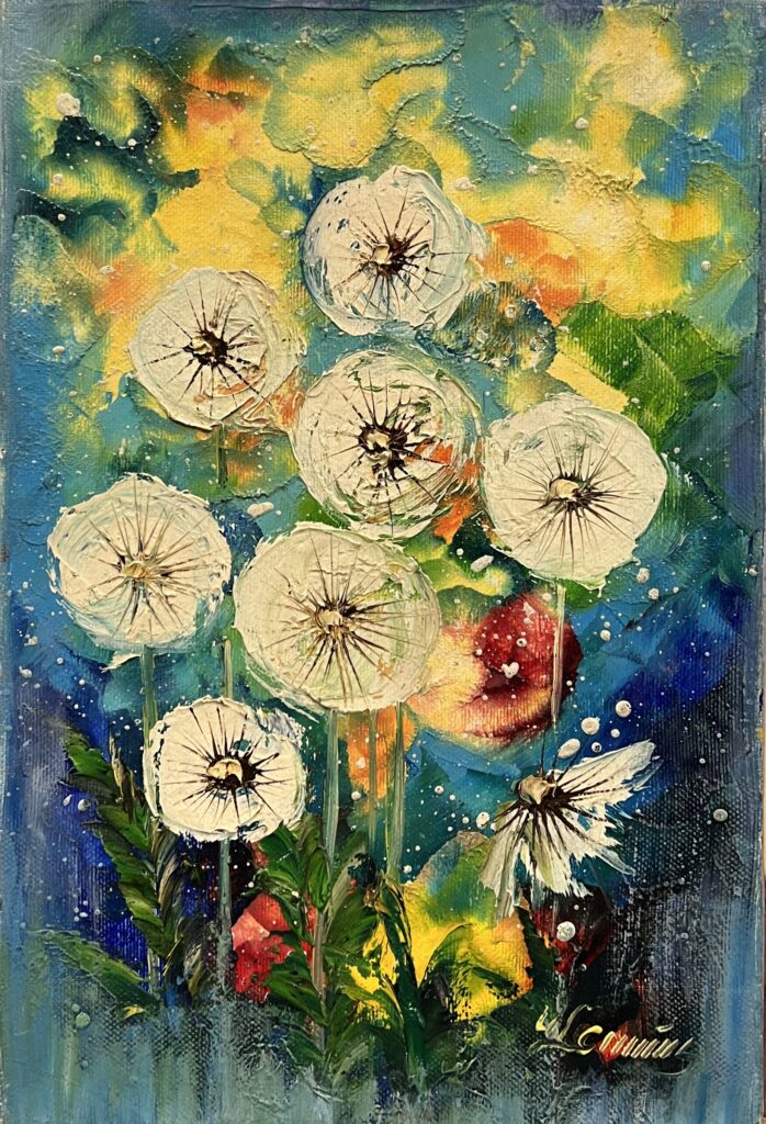 Wishes in the Wind brings a whimsical, dreamlike quality to a familiar subject dandelions ready to take flight. Set against a cosmic swirl of vivid blues, yellows, and reds, the delicate white seed heads appear almost luminous. A single petal floats away, suggesting movement and transience. Urszula LemaΕska combines bold color with ethereal softness, capturing the fleeting magic of a wish whispered to the breeze.