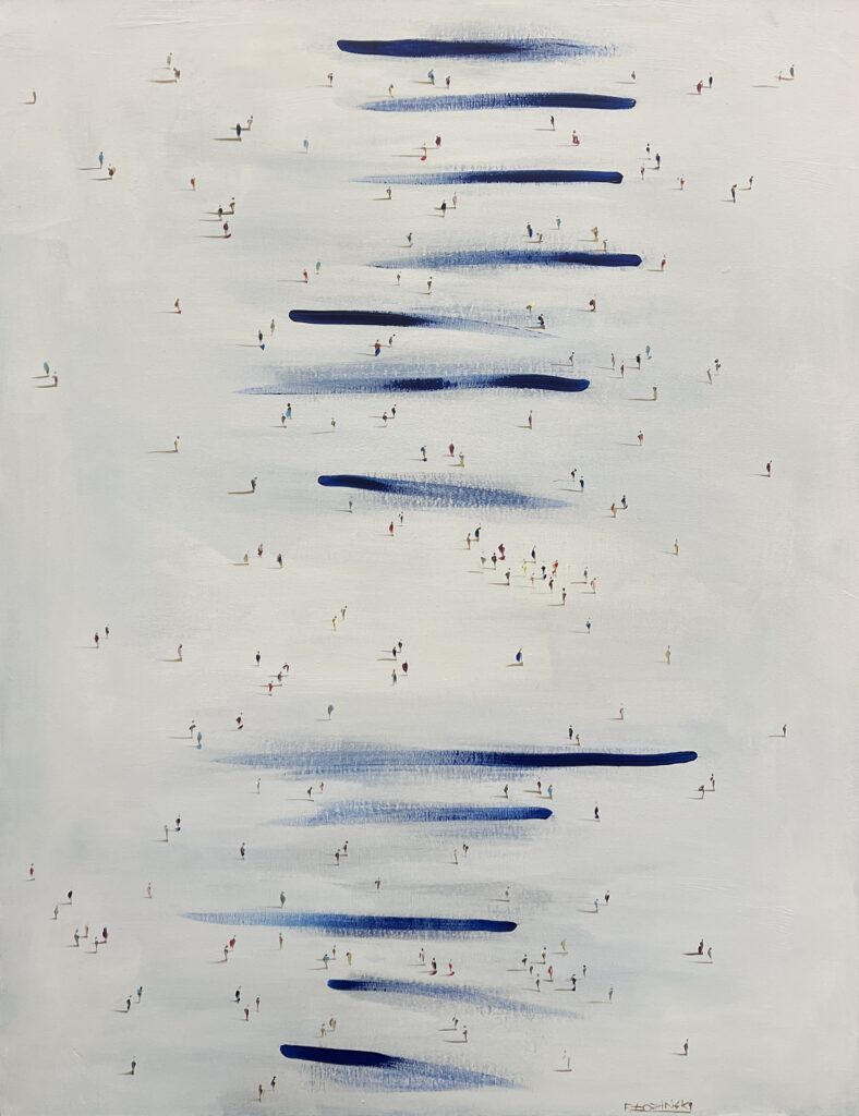 In this enchanting piece, a tapestry of minute figures dances across an expansive canvas, reminiscent of a serene afternoon by the sea. The artist employs a minimalist palette, dominated by delicate blues and muted pastels, to evoke an airy and ethereal quality. The deliberate brushstrokes of indigo streak across the scene, conjuring waves or undercurrents that guide the eye from top to bottom.