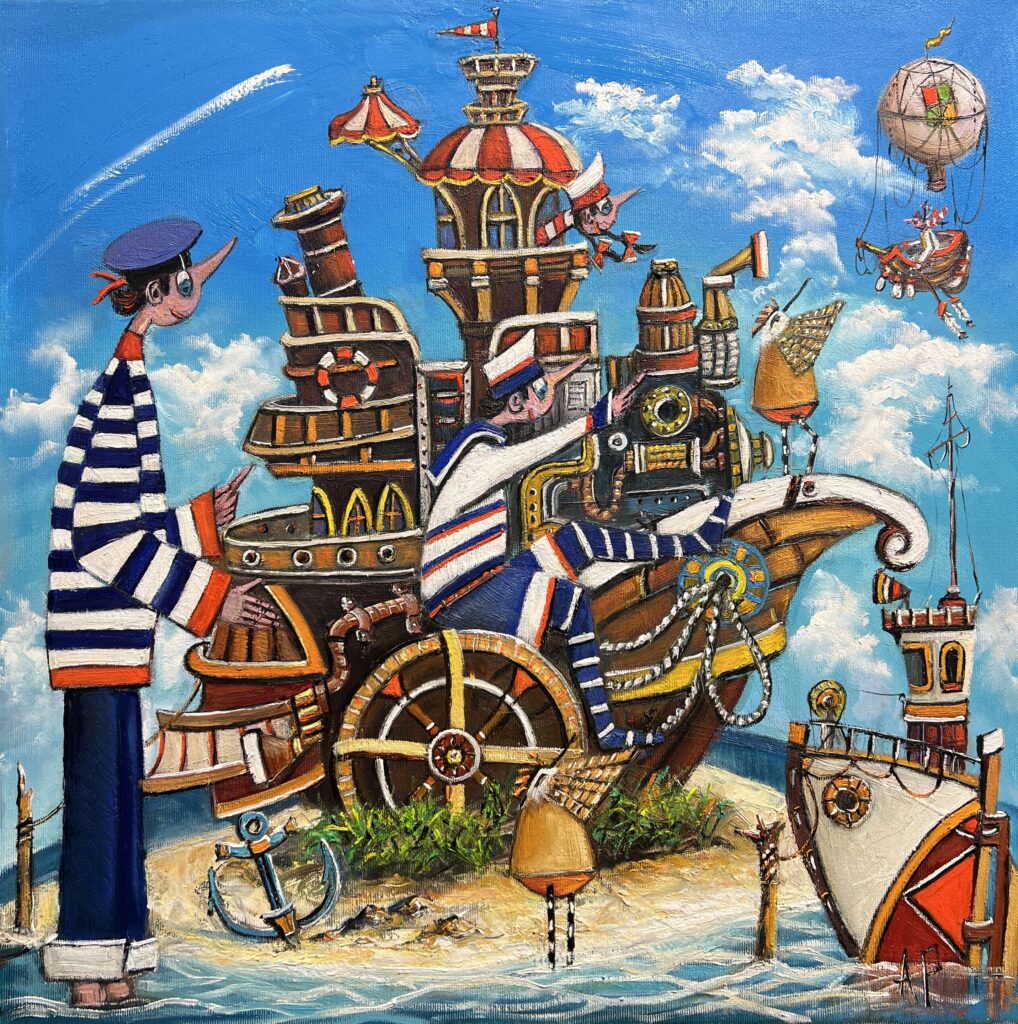 In a whimsical tableau that dances between fantasy and reality, the artist presents a charming maritime scene brimming with playful eccentricity. The composition exudes a childlike wonder, with sailors donned in jaunty stripes navigating a fantastical vessel that seems to have sailed straight from the pages of a storybook. Vivid blues and rich earthy tones create a vibrant contrast, enhancing the dreamlike quality of the piece. There is a delightful nod to steampunk with its intricate, gear-laden machinery, while the cloud-dappled skies hint at impressionistic influences. This enchanting work invites viewers to embark on a voyage of imagination, where every element pulses with life and creativity, making it a captivating addition to any art lover's collection.
