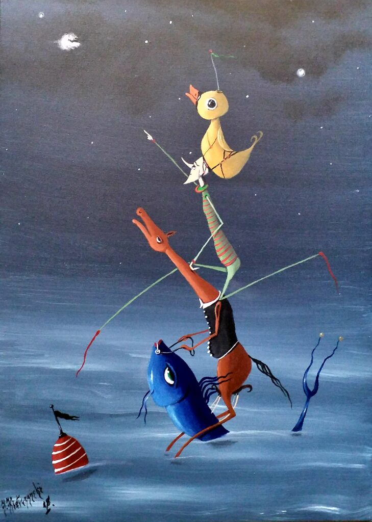 His art is inspired by Bosch and Holland art masters. He designed theater set for “Life is Beautiful”.