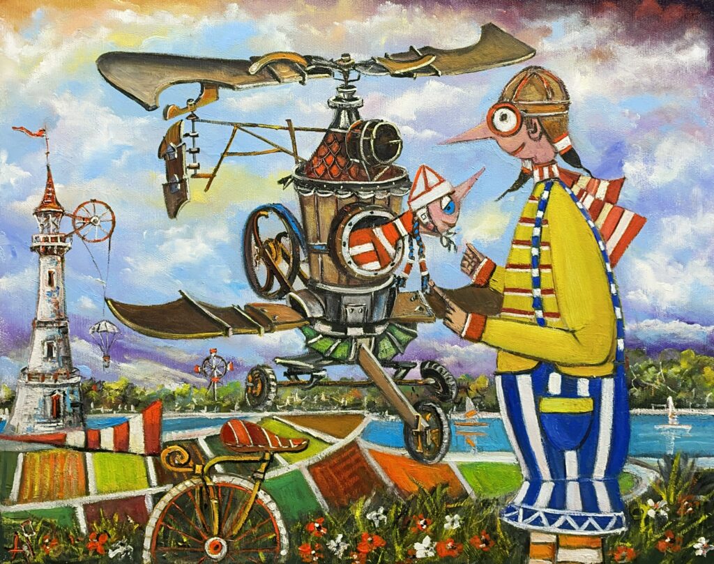 Hundreds of paintings and sculptures are in collections all over the world, including USA, New Zealand and even Afghanistan also in all European countries. Currently inspired by ceramic art in a funny way trying to tell about human passions. Behind the fairy-tale decorations are hidden the deepest human passions and desires. Canvas stretched on wooden frame. Colors of the painting may slightly differ from photos due to screen settings.