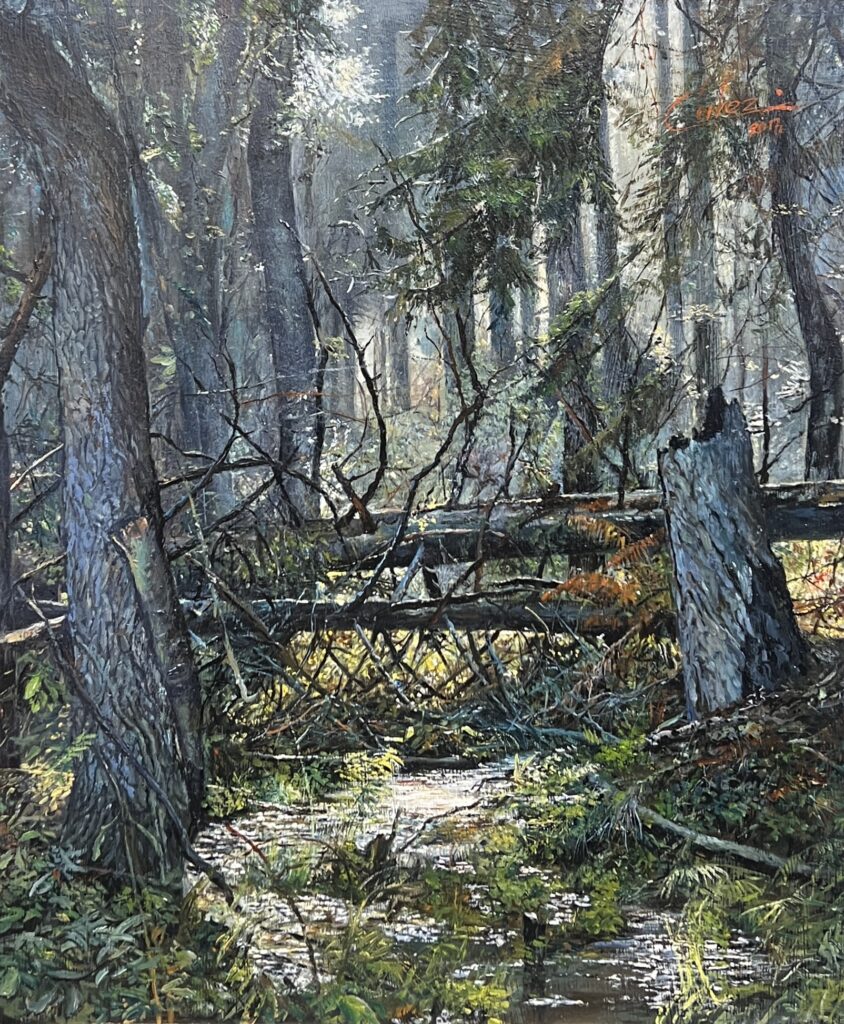 A captivating symphony of nature unfolds in this mesmerizing forest scene, where light dances playfully through a tapestry of foliage and fallen branches. The artist deftly captures the serene chaos of the wild, harmonizing contrasting hues of deep emerald and soft earth tones with masterful strokes. The composition, alive with texture and depth, draws the viewer into a secluded sanctuary where nature reigns supreme. Reminiscent of romanticism, this painting evokes a sense of mystery and exploration, urging one to linger and absorb the tranquil whispers of the woodland. A tribute to natureβs untamed beauty, this piece is a timeless testament to the artistβs skill and vision.